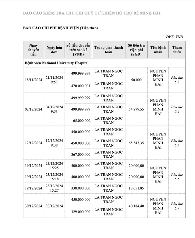 Đáng chú ý, Kiểm toán Đại Á Việt Nam cũng lưu ý, vào ngày 30-12-2024, Bệnh viện National University Hospital đã phát hành phiếu đề nghị thanh toán số tiền xấp xỉ 40.000 đô la Singapore, tương đương 779 triệu đồng. Cùng ngày, tài khoản quỹ từ thiện Pham Van Thoai _1296 (MBBank) đã chuyển khoản số tiền tương ứng đến bên trung gian là La Tran Ngoc Tran, nhằm thanh toán khoản chi phí này.