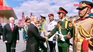 Khoảnh khắc chào điều lệnh, bắt tay Tổng thống Nga của Trung tá Phạm Khắc Giang – chỉ huy đội duyệt binh Quân đội nhân dân Việt Nam đang viral khắp MXH (Ảnh chụp màn hình)