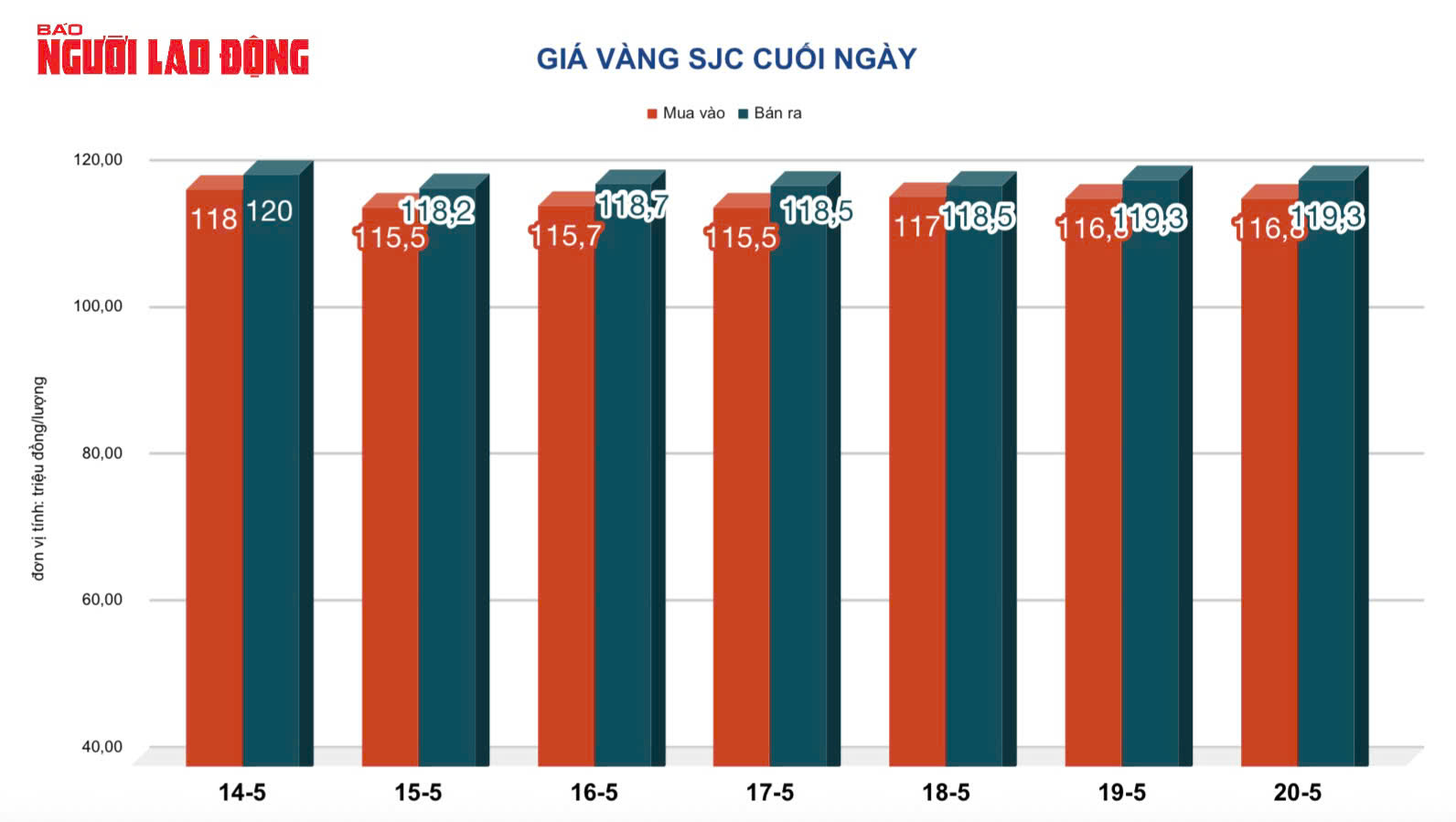 Tại Việt Nam, đến cuối ngày 20-5, giá vàng SJC được niêm yết ở mức 119,3 triệu đồng/lượng (bán ra), trong khi giá vàng nhẫn đạt 114 triệu đồng/lượng.