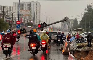 Cột đèn tín hiệu giao thông trên quốc lộ 13 bị mưa gió quật ngã. Ảnh: VnExpress